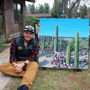 “My artwork delves into the relationship between humans and the natural world, capturing the essence of the spaces where we interact. Drawing inspiration from time spent in the wilderness, conservation projects, and family hikes, my paintings encapsulate unique moments within special places. Working in small scale, my paintings employ a layering technique informed by my background in printmaking. Each layer adds depth, while the active line work mirrors the intricacies of etching. With a fondness for public lands, my choice of subjects reflects the beauty and significance of these spaces. My art aims to celebrate and share the natural world in a succinct and evocative manner.”
